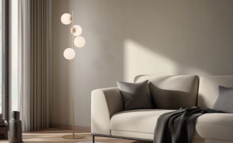 Las lámparas de pie esféricas parecen esculturas modernas y crean elegantes acentos en la habitación como una declaración de diseño, ya sea en el salón junto al sofá, en el dormitorio como iluminación de zona suave o en el pasillo como reclamo atmosférico. Los modelos con globos de cristal proporcionan una iluminación sin deslumbramientos y bañan la estancia con una agradable luz difusa.