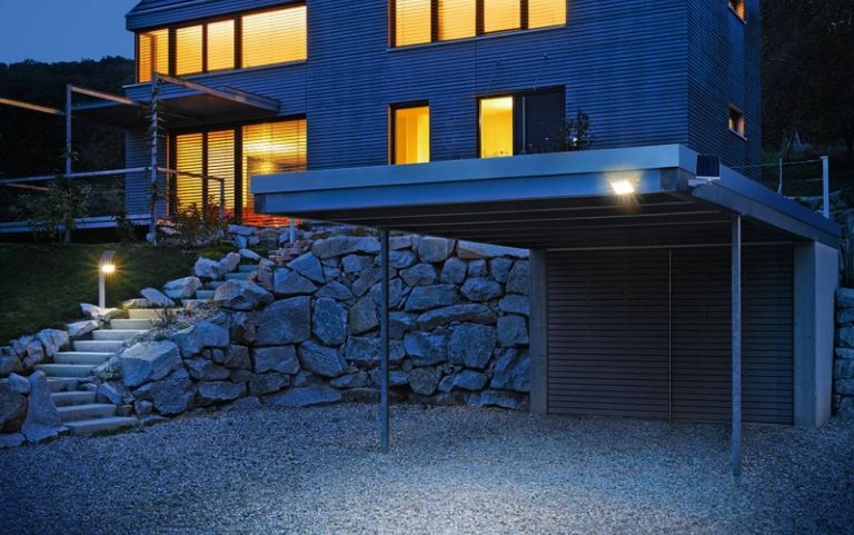 Una lámpara de patio con detector de movimiento enciende la luz en cuanto se acerca un coche, lo que facilita la orientación y aumenta la seguridad. Como la luz se apaga automáticamente, se ahorra energía. En el caso de las entradas de vehículos, el ángulo de detección debe seleccionarse de forma que no cubra la propiedad vecina.