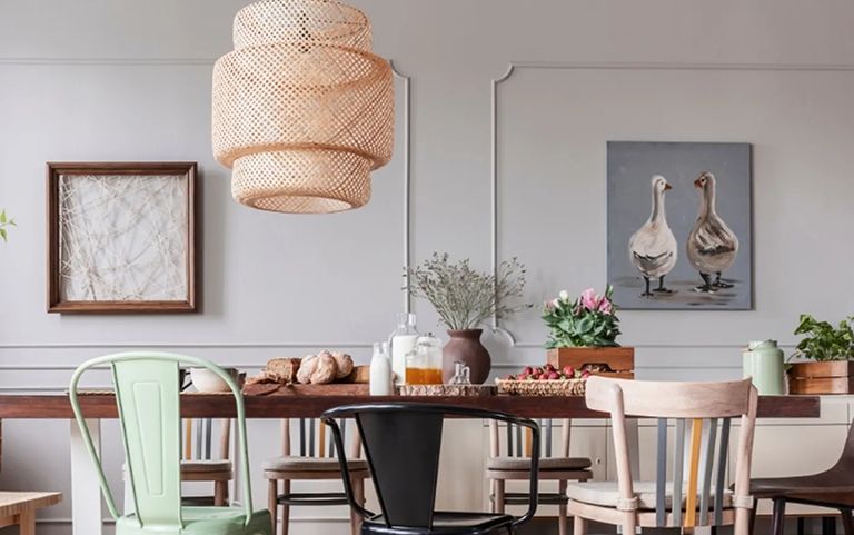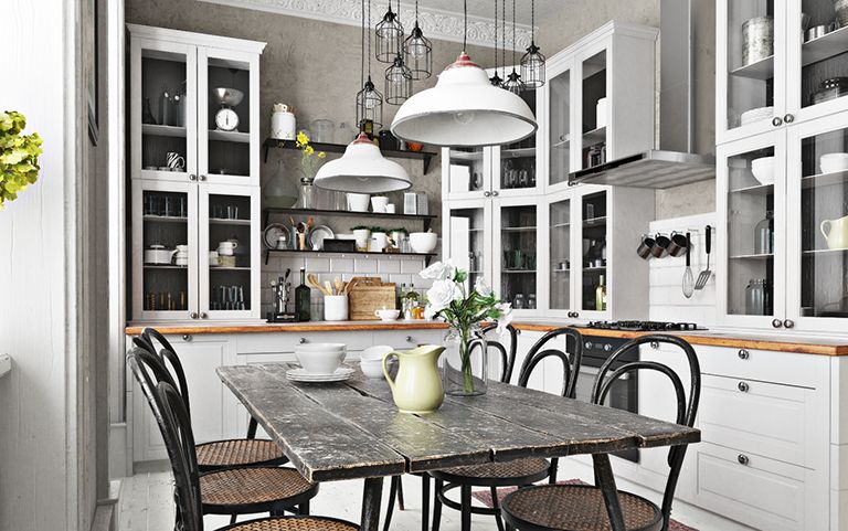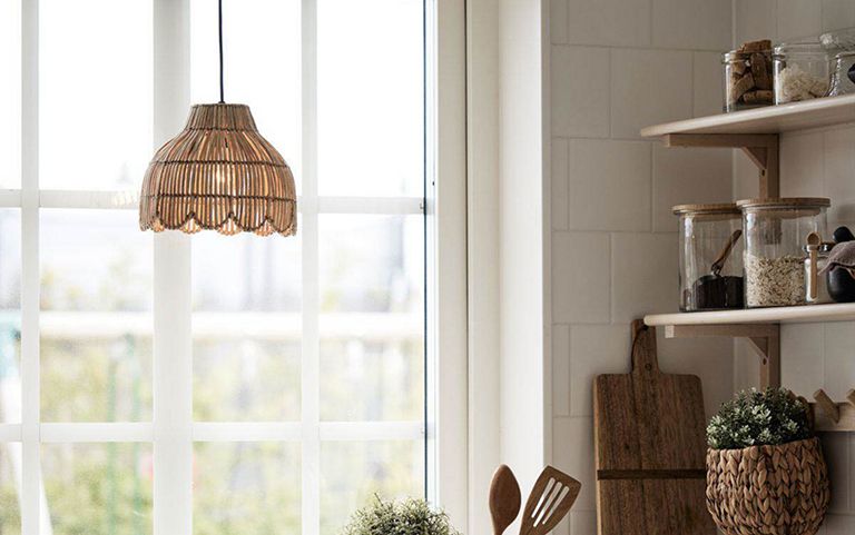 La típica cocina de casa de campo suele utilizar lámparas de cerámica para crear un ambiente tradicional. Sin embargo, hay mucho margen para la individualidad. Las lámparas de color cobre, por ejemplo, desprenden un toque de nostalgia, mientras que las de madera aportan un ambiente acogedor y natural al salón-cocina.