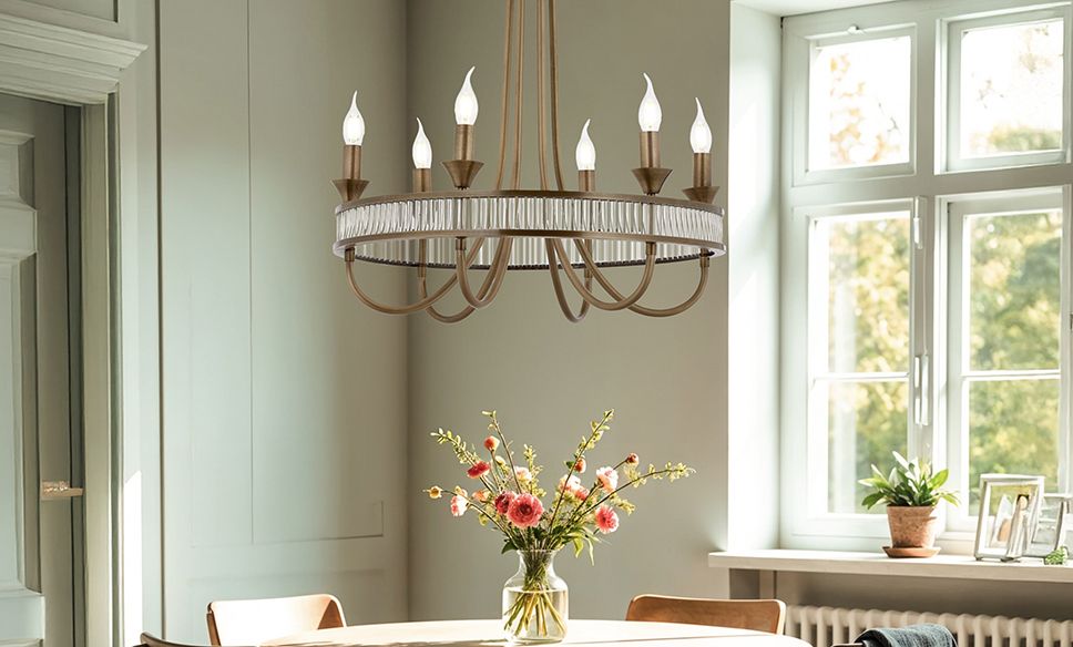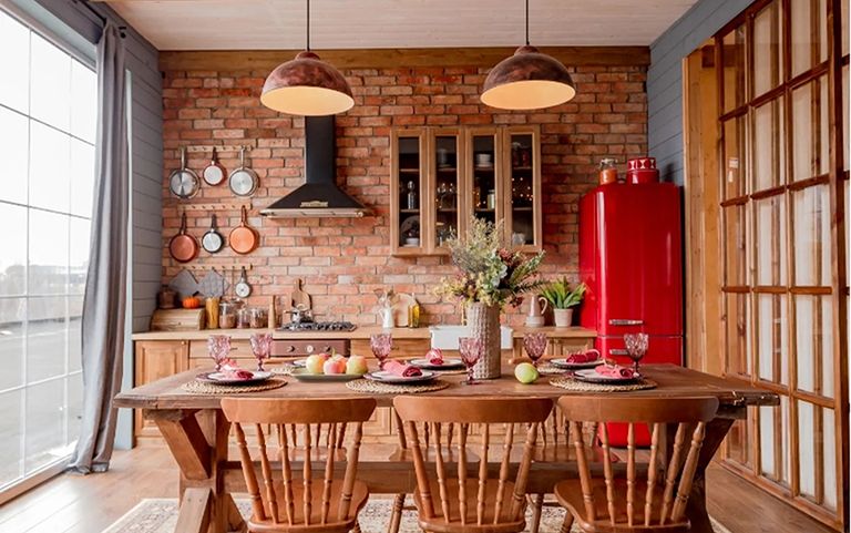 Las amplias pantallas de cerámica, los cristales de color ámbar y los marcos de hierro forjado encarnan la clásica casa de campo. Cuál de las dos variantes del estilo de casa de campo tiende a favorecer es particularmente evidente en el resto del mobiliario. Los muebles tradicionales, a menudo en un elegante blanco o con un encantador acabado vintage, los elementos de pared de ladrillo y los suelos y mesas de madera oscura son el interior perfecto para las luces de una casa de campo de estilo rústico.