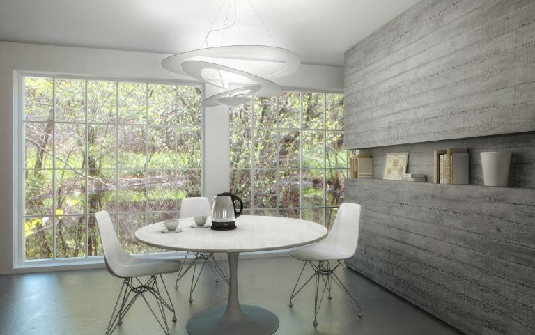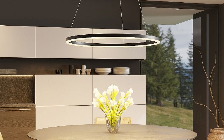 El haz de luz de las lámparas colgantes rodea la mesa de comedor y las sillas vecinas. Esto crea un ambiente acogedor y difumina suavemente el entorno.