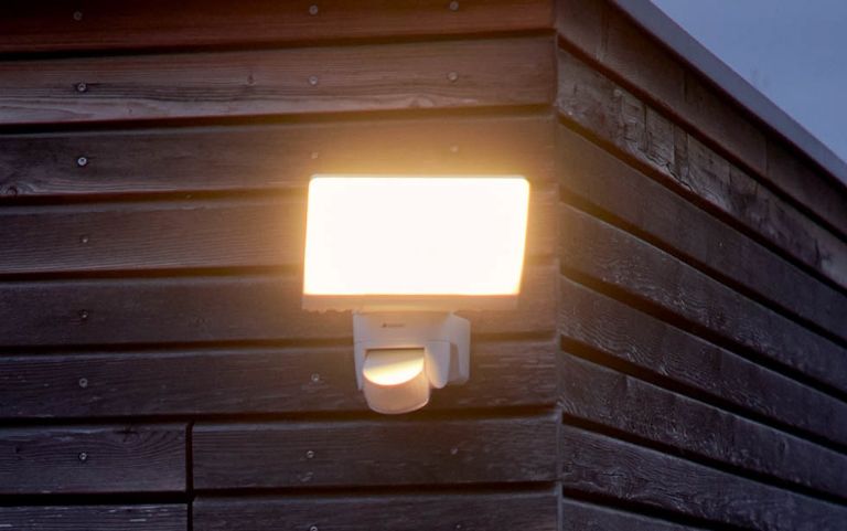 Los grandes espacios exteriores se iluminan con focos murales de exterior con detectores de movimiento. Proporcionan una luz óptima para conducir o caminar y, gracias al sensor, sólo están en funcionamiento cuando se necesitan.
