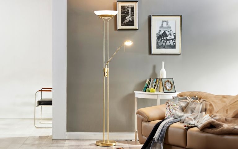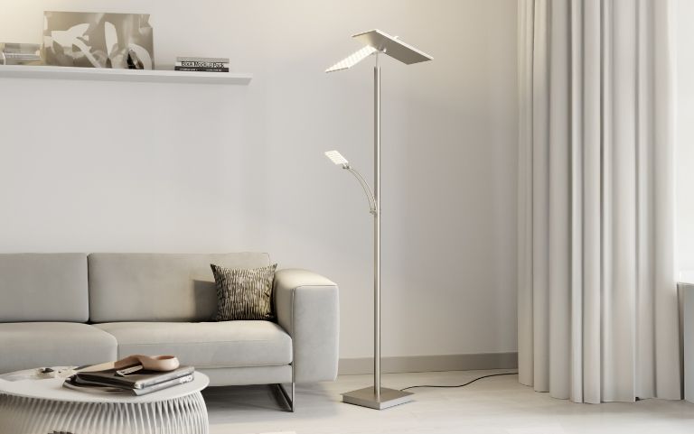 La lámpara de pie con brazo de lectura adicional es un excelente ejemplo de la combinación de iluminación indirecta de techo y luz directa. Mientras que el foco situado en la cabeza de la lámpara de pie apunta hacia el techo y la luz que emana de él se distribuye indirectamente por la habitación, el brazo de lectura se orienta hacia los libros y similares, proporcionando una luminosidad adicional para la lectura.