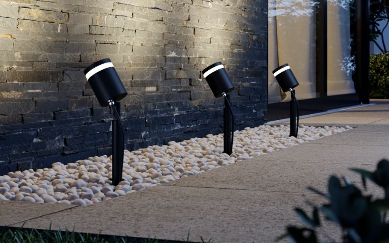 Los focos con pica flexibles son ideales para el jardín y su vegetación cambiante. Decoran parterres y arbustos iluminándolos desde abajo. Esto crea interesantes efectos de luces y sombras.
