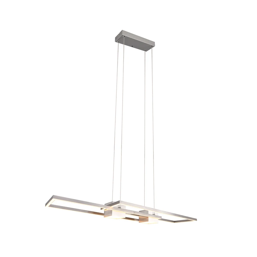 Lámpara colgante LED Albany: la elegancia se une a la funcionalidad Descubra la extraordinaria lámpara colgante LED Albany, que impresiona por su diseño moderno y angular y por la combinación de iluminación ascendente y descendente. Esta luminaria no sólo es un HighLight visual, sino que también ofrece numerosas funciones prácticas: Control individual de la luz: Puede ajustar el color de la luz y la luminosidad de forma continua mediante el control remoto suministrado. Alternativamente, la luminosidad también puede ajustarse en tres niveles mediante un interruptor de luz convencional. Luz nocturna y función de memoria: La función de luz nocturna integrada garantiza una iluminación agradable por la noche, mientras que la función de memoria guarda sus ajustes preferidos. La lámpara colgante Albany en una combinación de colores contemporánea añade un acento elegante a cualquier habitación y encaja perfectamente en los conceptos de vida modernos. Experimente la simbiosis perfecta de diseño y funcionalidad con la lámpara colgante LED Albany.