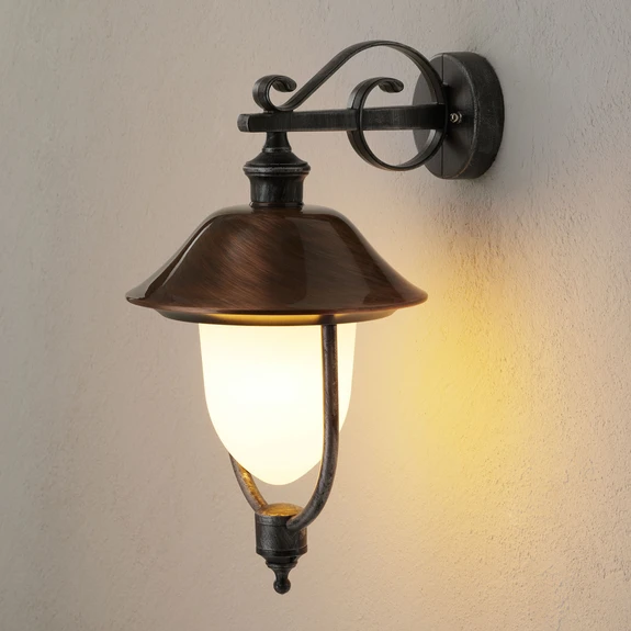 Gran aplique de exterior Peggy en diseño colgante El aplique de exterior Peggy, de diseño clásico, impresiona por su bella apariencia. Llama especialmente la atención su pantalla cobriza, que le da un toque especial. Peggy está fabricado en cristal y aluminio fundido a presión y es muy robusto. También proporciona unas condiciones de iluminación ideales en la propiedad en la oscuridad. El eficaz aplique de exterior enriquece cualquier zona exterior. Como fuentes de luz también son adecuadas las bombillas LED y de bajo consumo.