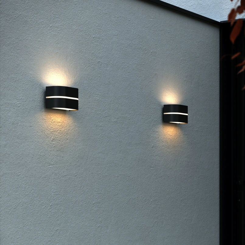 Moderno aplique para exterior Sibelis con tres salidas de luz El aplique para exterior Sibelis con carcasa de plástico negro en forma semicircular es una agradable fuente de luz para zonas exteriores modernas. La luz de la bombilla E27 se emite hacia arriba, hacia abajo y también hacia delante a través de una estrecha tira horizontal - Grado de protección IP44 - Temperatura ambiente durante el funcionamiento: - 20 °C a + 35 °C