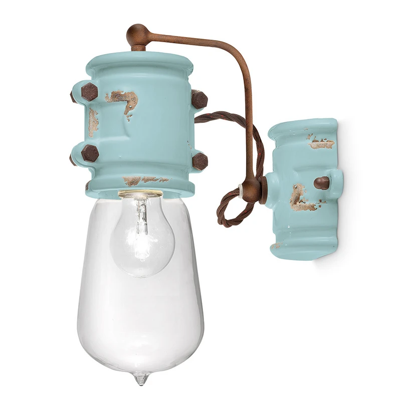 Aplique de pared de cerámica C1523 de estilo vintage Con el aplique de pared C1523, los diseñadores italianos se han centrado en lo esencial. Se compone casi exclusivamente de un soporte de pared y una portalámpara, creados en un estilo de aspecto industrial y acabados con una pátina blanca vintage. La fuente de luz se inserta en una pantalla de cristal transparente con forma de lámpara de bombilla antigua. Los soportes curvados en acabado de metal oxidado completan la luminaria de estilo vintage. Fabricado en Italia y fruto de métodos de fabricación tradicionales y patrones y diseños tradicionales, el aplique de pared C1523 es un producto único del fabricante italiano.