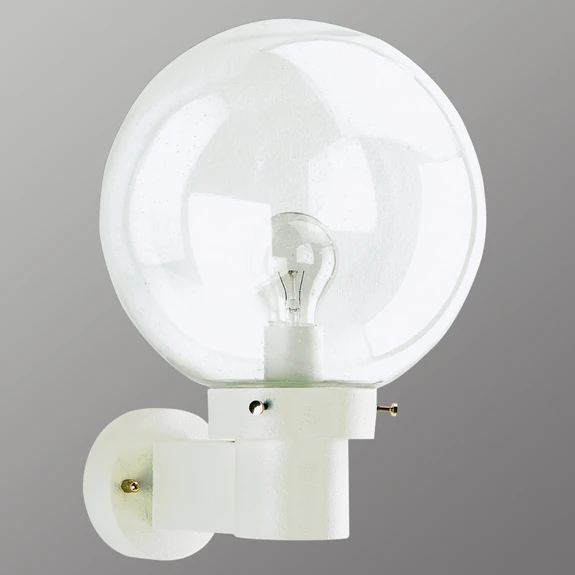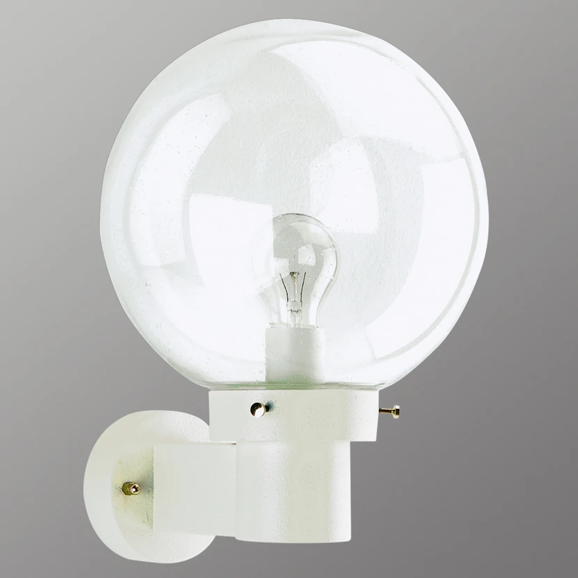 Esta hermosa lámpara de pared para uso exterior se presenta con un robusto marco de aluminio fundido y un gran vidrio esférico para lámparas, hecho de vidrio de burbujas transparentes, que proporciona una luz brillante y agradable y una iluminación óptima. Equipado con la clase de protección IP44.
