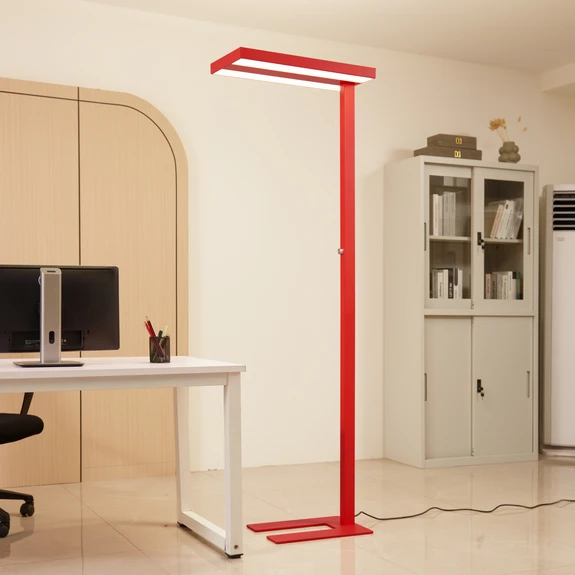 Funcional lámpara de pie LED para oficina Logan con base en forma de U y regulador rotativo Con esta lámpara de pie LED para oficina se dirige una gran cantidad de luz (60% - 3.600 lúmenes) hacia arriba, mientras que el 40% restante (2.400 lúmenes) brilla hacia abajo, lo que resulta en una combinación de emisión de luz directa e indirecta, algo especialmente deseable en las lámparas de pie para oficina, ya que así se crea una distribución de la luz de aspecto natural. De este modo, el puesto de trabajo se ilumina de la forma más uniforme posible y se reduce la fatiga ocular y corporal, ya que uno se siente fresco y concentrado durante más tiempo bajo la luz de una lámpara de pie para oficina bien iluminada. La cubierta inferior sobre los LED tiene una estructura prismática, lo que significa que la luz no se percibe como deslumbrante. Un regulador rotativo integrado también permite un ajuste continuo de la luminosidad, que debe adaptarse a las preferencias personales, ya que una persona puede necesitar mucha luz, mientras que otra puede sentirse rápidamente sobreestimulada por un exceso de luz. Las lámparas de pie con atenuador son, por supuesto, una muy buena elección y todo el mundo tiene la sensación de que se están teniendo en cuenta sus propias necesidades y que se está buscando la mejor solución posible cuando se trata de conciliar la individualidad de las personas para que todos puedan sentirse cómodos. Por último, la base en forma de U permite colocar la lámpara de pie LED para oficina de la mejor manera posible, ya que las patas de la mesa ya no son un problema irresoluble porque la base en forma de U simplemente se curva alrededor de ellas - sin parpadeos - UGR < 19