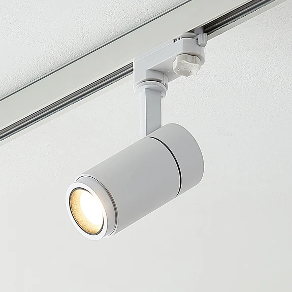 Con potencia luminosa regulable - foco de riel LED Nanna El foco de riel LED Nanna de aluminio blanco dispone de un cabezal de luminaria regulable individualmente que no sólo se puede girar y bascular, sino que también tiene un ángulo de haz variable. La lente puede variar fácilmente de 15° a 60° con sólo girar el cabezal de la luminaria. En el foco hay pequeñas marcas para ajustar correctamente el ángulo. Nanna es adecuado como foco de riel LED para sistemas de trifásico y puede utilizarse, por ejemplo, para la iluminación de tiendas en el sector comercial. Dependiendo de si se desea iluminar específicamente un objeto o toda una zona, el foco de riel Nanna puede proporcionar luz en el ángulo correcto. Con un valor CRI superior a 90, se puede conseguir un rendimiento de color muy bueno, de modo que los tonos de color se reproducen con la mayor fidelidad posible con el foco de riel Nanna.