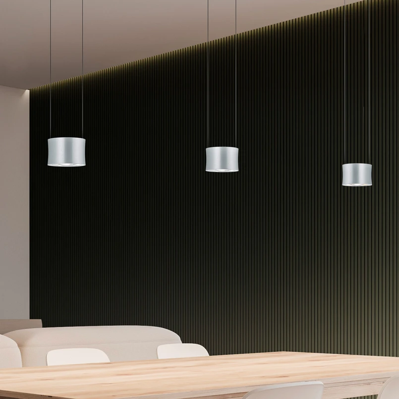 Lámpara colgante Impulse LED de tres luces en níquel mate con detalles cromadosLa lámpara colgante Impulse de alta calidad del fabricante alemán BANKAMP se utiliza para la iluminación directa e indirecta en interiores modernos. Tres elementos luminosos cilíndricos de aluminio cuelgan de la larga cubierta de hierro. La luz blanca cálida de los LED integrados brilla hacia abajo y hacia arriba a través de las cubiertas de cristal transparente. Presenta los objetos de la habitación en sus colores naturales y puede regularse su luminosidad mediante reguladores externos de corte de fase. Durante la instalación, la altura de suspensión se puede ajustar individualmente de 90 a 150 cm.