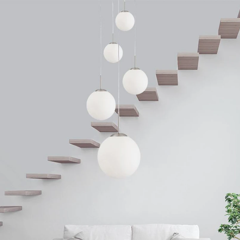 Lámpara colgante Bollique, 5 luces de acero con pantallas blancas opalescentes La lámpara colgante Bollique de 5 luces confiere un aspecto contemporáneo a cualquier interior. El dosel y los soportes de las pantallas son de metal en color acero, mientras que las pantallas esféricas de diferentes tamaños son de cristal blanco opalino. Las pantallas pueden suspenderse de los cables hasta donde se desee durante la instalación, y la suspensión máxima de 350 cm permite instalar la lámpara colgante también en huecos de escalera altos, por ejemplo.