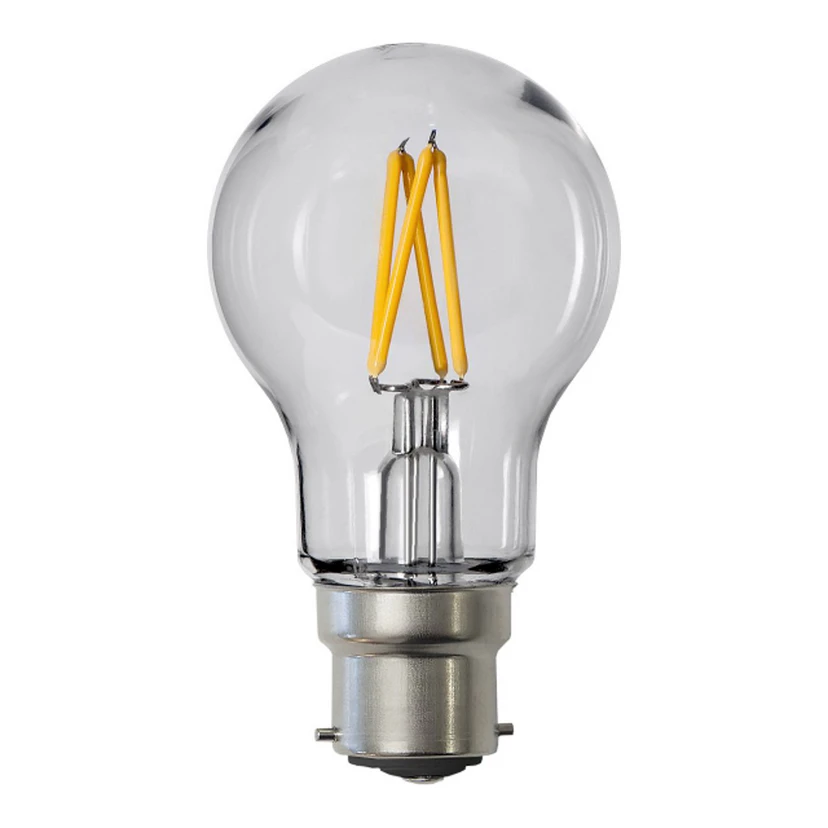Iluminador LED B22 transparente, bombilla A55, 2,4 W, blanco cálido Este iluminador LED blanco cálido de 2,4 W con casquillo B22 está moldeado como una bombilla A55 con una bombilla convencional transparente fabricada en PVC inastillable. Los LED están dispuestos en óptica de filamento.