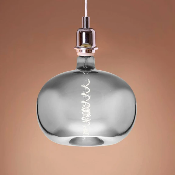 Bombilla LED E27 4W de gran tamaño en forma de manzana Esta bombilla LED de gran tamaño con casquillo E27 llama la atención en todas las luminarias abiertas. Tiene la forma de una manzana, el cristal está cromado pero sigue siendo transparente, de modo que los filamentos LED, bellamente dispuestos en forma de espiral, son visibles cuando están encendidos y se muestran en todo su esplendor - atenuable con muchos atenuadores comunes como Busch, Gira, Jung, Siemens y muchos más.