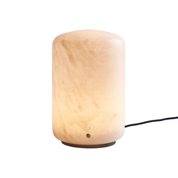 Armonioso dispensador de luz adicional para salones y salas de estar - lámpara de mesa LED Capsule cilíndrica de alabastro naturalCon una luz agradable, un diseño suave y un resplandor natural, la lámpara de mesa LED Capsule resulta agradable en el alféizar de la ventana, la mesilla de noche o el aparador. Este luminoso accesorio ha sido diseñado por el prestigioso estudio británico de arquitectura y urbanismo Foster Partners. Una base plana de latón envejecido soporta el cuerpo de la lámpara, que es de alabastro jaspeado de color blanco cremoso. En él se aloja la fuente de luz LED, que puede regularse mediante el regulador táctil de la luminaria. De este modo, la temperatura de color de la luz pasa de 2.700 K a plena potencia luminosa a 1.800 K en el nivel de regulación más bajo (dim-to-warm). Además, la excelente reproducción cromática (CRI 95) produce una maravillosa presentación del material de alabastro y de los objetos iluminados en el entorno.