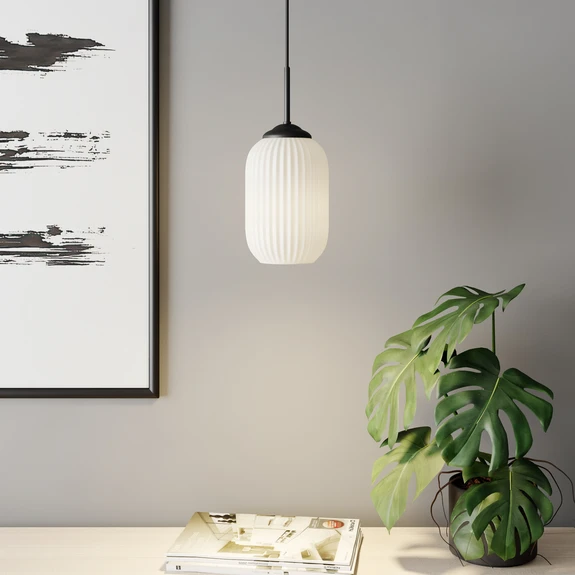 Lámpara colgante Riflet con pantalla de cristal blanco estriado La lámpara colgante Riflet, con su pantalla estrecha y casi ovalada de cristal blanco opalino con un bonito estriado en todo el contorno, crea una luz muy agradable y sin deslumbramientos e ilumina el entorno de forma suave y uniforme. Puede utilizarse individualmente para iluminar mesas o zonas más pequeñas, o suspenderse en filas o grupos del mismo o distinto tamaño para iluminar mesas o mostradores grandes. Riflet es una serie de luminarias de la marca danesa Dyberg Larsen, una empresa centrada en el desarrollo de luminarias asequibles, de bonito diseño y buena calidad.