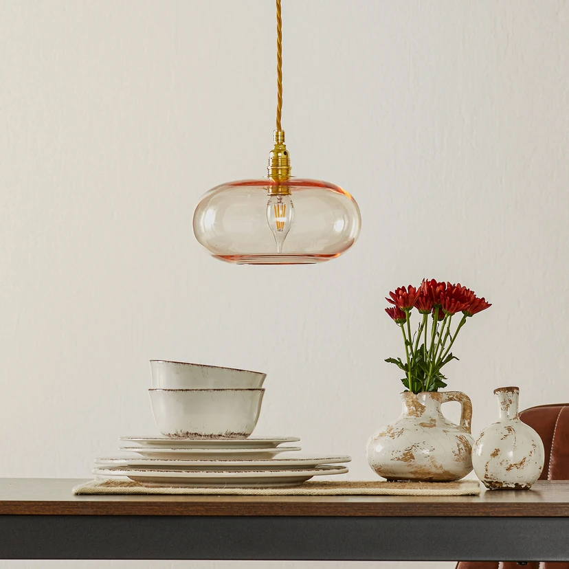 Lámpara colgante Horizon de diseño decorativo con pantalla de cristal soplado a mano La lámpara colgante Horizon es una atracción estética y una fuente de luz para una iluminación ambiental especialmente atmosférica en cualquier lugar de la casa, ya sea en el salón encima de la mesa de centro o encima de una mesa de comedor. Das Glas ist transparent, so dass die Lamp von allen Seiten verwendet wird und ihre Licht auch aus allen Seiten in die Wohnung ermöglicht wird. Por ello, se recomienda especialmente el uso de una bombilla con filamento decorativo. Esto realza aún más el atractivo visual de la lámpara colgante Horizon. Das können sich mit den Ansätze entsprechenden Lichtführer verfügbar sein. La pantalla es de vidrio soplado. Cada lámpara es única; debido al proceso de fabricación, puede haber ligeras variaciones como pequeñas inclusiones de aire, etc. - fabricada por EBB & FLOW (Dinamarca) - con cordón textil tejido y retorcido en oro