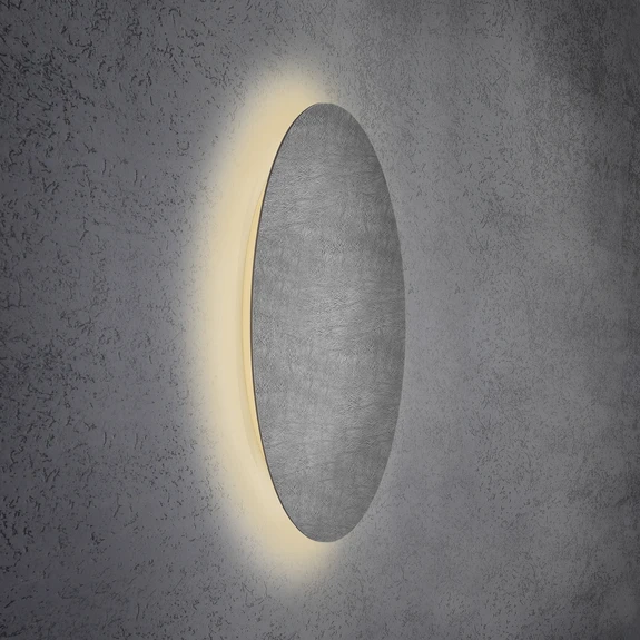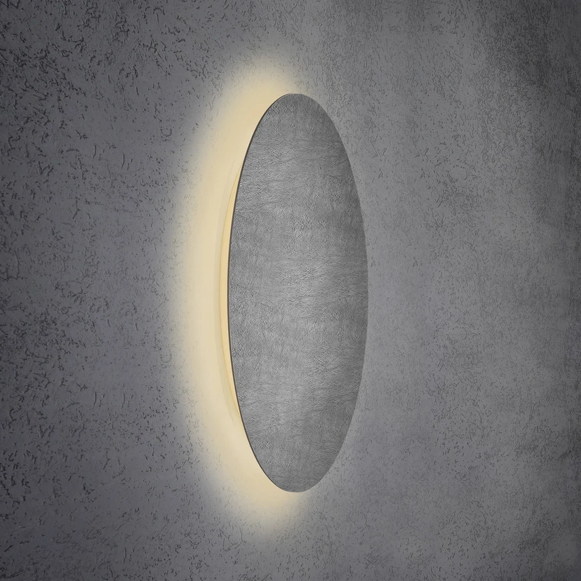 La luminaria de pared Blade LED del fabricante Escale se presenta visualmente a la altura de los tiempos y con un efecto luminoso agradablemente libre de deslumbramientos. Una cubierta plana y circular de aluminio con estructura irregular de color gris hormigón forma la sección visible. Los LEDs se montan detrás de ella para que su luz blanca y cálida salga por el estrecho hueco entre la tapa y la pared y se refleje en la parte posterior. Esto crea un patio iluminado de forma difusa en la pared alrededor de la luminaria.