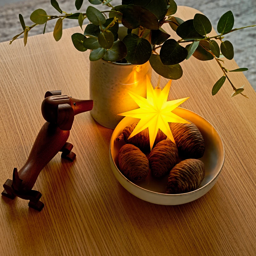 Estrella LED STERNTALER, amarilla, Ø 11 cm, 9 puntas, IP44, pilas incluidas