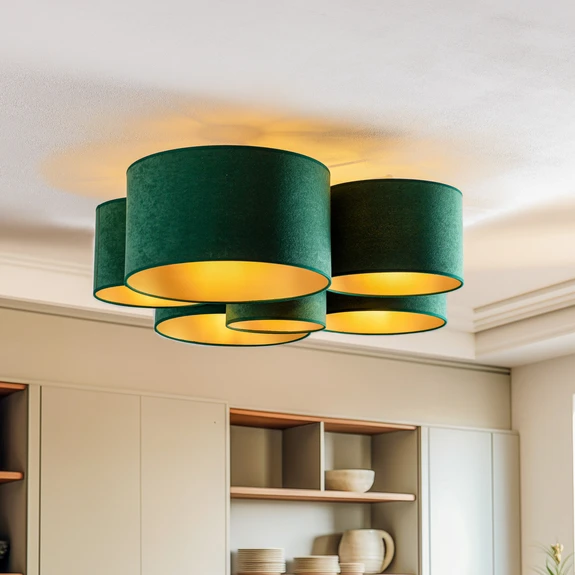 La lámpara de techo Euluna Lodge, con 6 luces en verde y dorado, combina un diseño moderno con materiales de alta calidad como el textil, el laminado y el metal. Esta lámpara fabricada en Europa aporta un toque elegante a cualquier estancia, ya sea el salón, el pasillo, el dormitorio o el comedor. La armoniosa combinación de colores verde y dorado confiere a la lámpara una elegancia atemporal que se integra a la perfección en diferentes estilos de decoración.