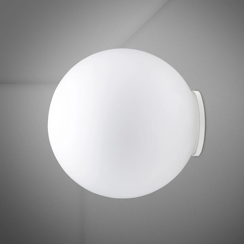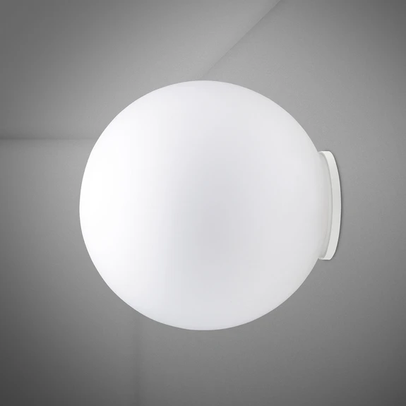 La luminaria de pared y techo Lumi Sfera, fabricada por Fabbian en Italia, es adecuada como fuente de luz de acento o como fuente de luz para todo el entorno, dependiendo de la potencia de la lámpara E27 utilizada. La sombra es una esfera de cristal blanco que brilla uniformemente y sin reflejos. Se apoya en un soporte de metal pintado de blanco.