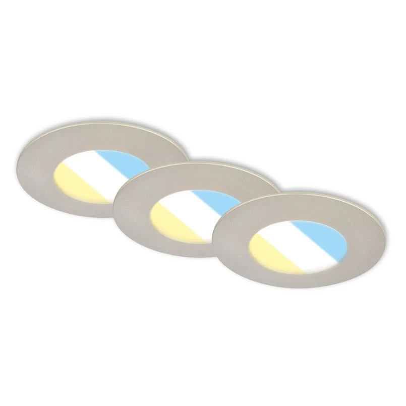 Foco empotrable LED 7598 en juego de 3 con color de luz regulable Una característica especial de este foco empotrable LED, que se suministra en un ventajoso juego de 3, es el color de luz regulable mediante un interruptor situado en la parte posterior. Esta característica lo convierte en un foco empotrable de uso universal en cualquier habitación. - Colores de luz ajustables: Blanco cálido (2.700 K), blanco universal (4.000 K) o luz diurna (6.500 K)