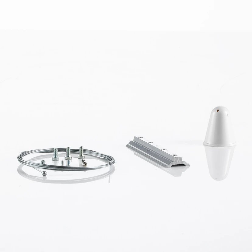 Este kit de suspensión con cable de acero de 200 cm, dosel y placa de conexión de 12 cm de largo permite el montaje suspendido de rieles trifásicos Ivela LKM.