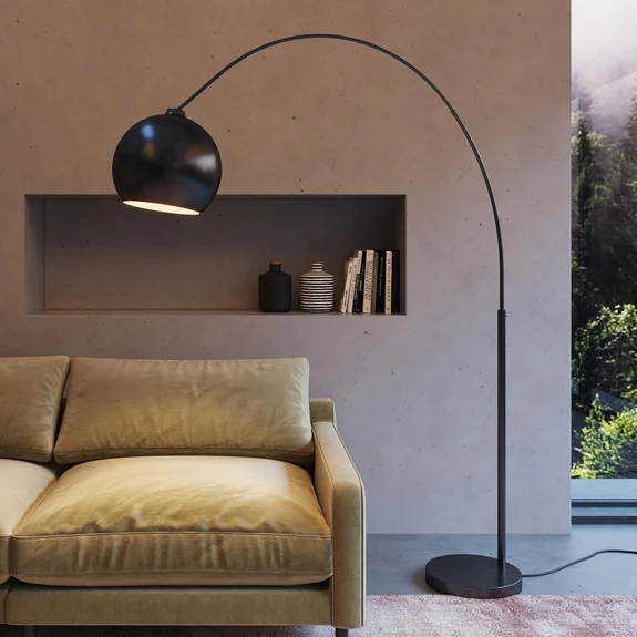 Lámpara de arco regulable en altura Lounge Small Deal Eco en elegante negroLa lámpara de pie Lounge Small Deal Eco, suavemente curvada, combina el diseño de los años 60 con el chic moderno de la era actual. El cuerpo es de acero lacado y completamente negro, lo que confiere a la luminaria una elegancia estilizada. Con una fuente de luz de su elección, puede proporcionar una iluminación agradable y atmosférica en el salón, ya sea como luz de lectura o como elegante iluminación adicional y de acento. Gracias a su moderna forma de arco, la luz se emite exactamente donde se desea. El arco puede regularse en altura y adaptarse así a diversas necesidades. La lámpara puede encenderse y apagarse mediante un interruptor de pedal situado en el cable de conexión revestido de tela. - Se suministra parcialmente desmontado