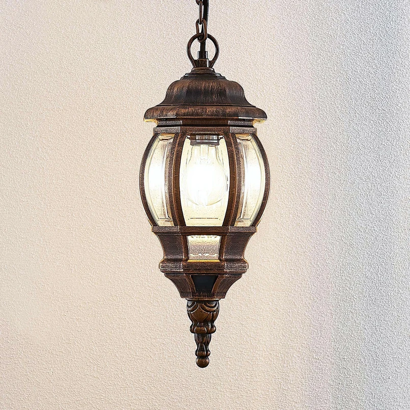 Esta lámpara colgante encaja un poco con los mitos de mil y una noche, porque con su forma y su acabado antiguo dorado con acabado cepillado, la luz exterior parece un poco oriental. La carcasa y los insertos transparentes están hechos de plástico robusto y la lámpara se caracteriza por la resistencia del agua de mar, de modo que también se puede utilizar cerca de la costa, donde hay aire salado.