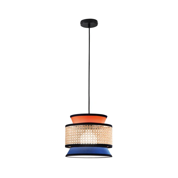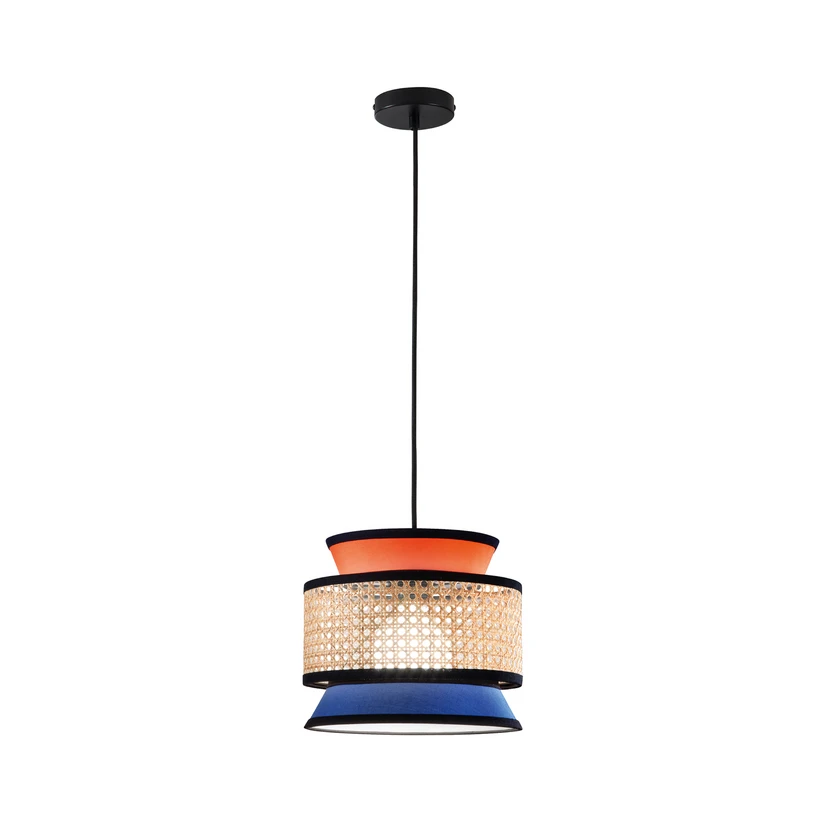 La lámpara colgante Gazebo combina materiales naturales como la tela y el ratán en un objeto de diseño único. Con su armoniosa combinación de colores en naranja, azul y tonos naturales, aporta un toque elegante y se integra a la perfección en diferentes estancias del hogar, como el salón, el comedor, el dormitorio o el pasillo.