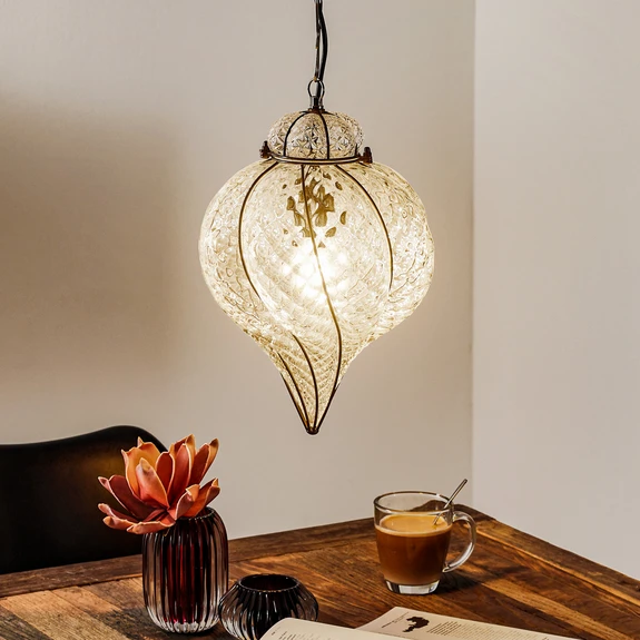 El vidrio soplado con una forma elegante adorna la lámpara colgante GOCCIALa gota -GOCCIA en italiano- era obviamente el epónimo de esta elegante lámpara colgante. Un marco de filigrana de acero inoxidable oscuro confiere al cristal de Murano soplado a boca su atractiva forma. Su superficie estructurada crea hermosos reflejos de luz que iluminan eficazmente la habitación y crean una atmósfera agradable que invita a quedarse. Las lámparas de este fabricante se fabrican artesanalmente en Italia con acero inoxidable y cristal. Cada producto es una pieza única con un carácter individual. Por ello, las ligeras variaciones de color en el material son un signo de la más alta calidad artesanal.