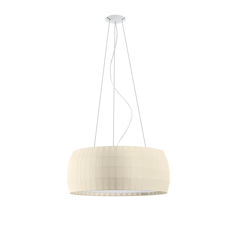 Atemporal Luminaria Isamu de suspensión con pantalla blanca nacarada de seda de poliéster Con su tejido de poliéster ligeramente translúcido, similar a la seda, tensado alrededor de la estructura interior y el difusor de policarbonato difusor de luz que cubre la abertura vertical de la pantalla, la luminaria Isamu de suspensión es una agradable fuente de luz para salones y salas de estar. También cuenta con una suspensión de tres finos cables y un dosel redondo de color blanco. Daniel Vila y Ester Pujol, fundadores del estudio de diseño español Nahtrang, son los responsables del concepto de la serie de luminarias Isamu.