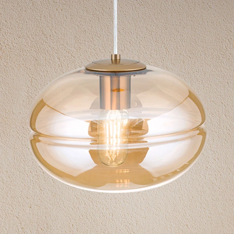 Lámpara colgante Richard con pantalla de cristal soplado a mano La lámpara colgante Richard es un modelo polifacético para muchas habitaciones y estilos de decoración, con una pantalla de cristal soplado a mano de forma bulbosa con hendiduras horizontales. La pantalla transparente contiene una portalámpara E27 (apta para T45), a la que debe acoplarse una bombilla con filamento transparente para completar el aspecto de la luminaria. La lámpara colgante puede utilizarse en el comedor, el salón o la cocina, donde la pantalla transparente ilumina no sólo la mesa, sino toda la estancia.