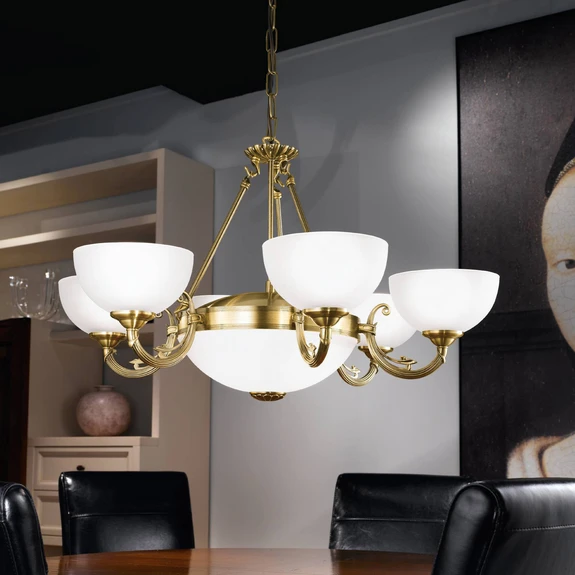 Savy es una lámpara colgante muy elegante y decorativa, la cual envuelve el espacio, no solo con su luz, sino también con su aspecto. El metal pavonado, que tras el tratamiento químico adopta el color negro, le confiere ese aspecto envejecido. El estilo rústico del metal se fusiona con la moderna óptica del vidrio opalino, dando como resultado una completa obra de arte. Cada una de las pantallas de cristal proporciona una iluminación agradable, dejan salir la luz hacia arriba y alojan la esfera de cristal en el centro que oculta dos bombillas.