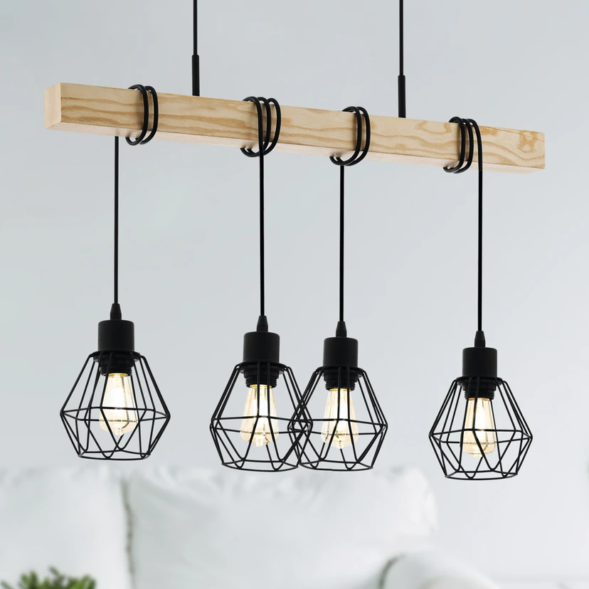Lámpara colgante Townshend, longitud 70 cm, negro/roble, 4 luces.