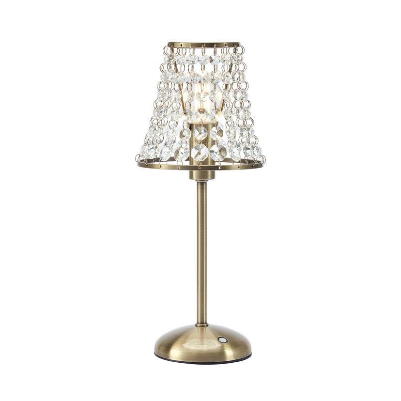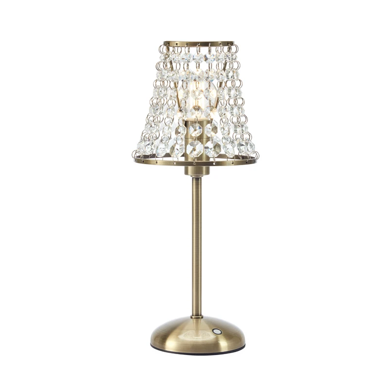 Lámpara de mesa Liora, latón antiguo/transparente, atenuable, estación de carga