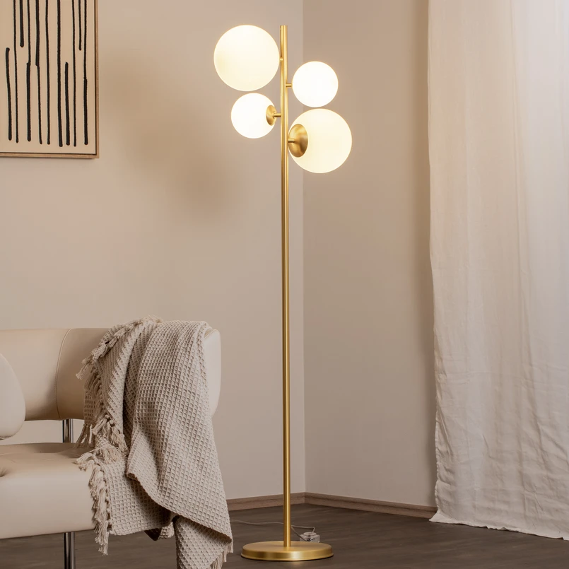 Lámpara de pie Joel, latón/blanco, 4 luces