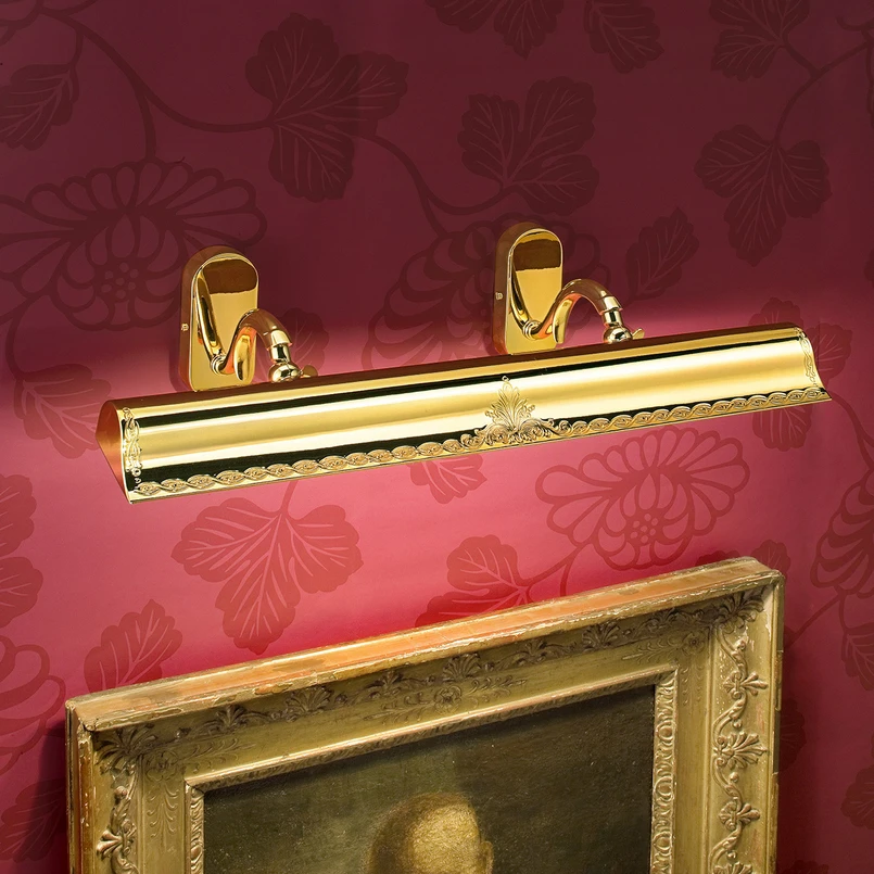 La luz de cuadros largos Lysanna estaba brillantemente dorada, con lo que incluso los cuadros grandes, fotos u otras decoraciones en la pared pueden ser puestos en la luz correcta. Los dos soportes curvados de la pared sostienen una larga y bella sombra con un borde floral en el que se insertan cuatro lámparas de vela con enchufes E14.