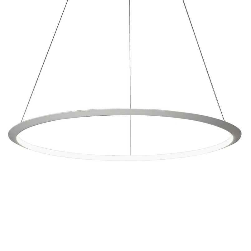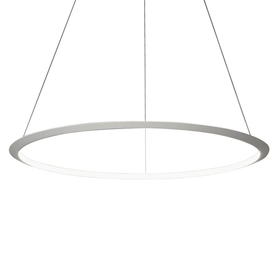 Esta moderna luminaria colgante es una fuente de luz llamativa en todos los sentidos, que también ilumina generosamente espacios interiores amplios, como salas de recepción o salones de actos. Circular está diseñado como un anillo gigantesco que se sostiene por tres delgados cables y casi parece flotar en el espacio. En todo el interior de la estructura de aluminio se ha incorporado un difusor de policabonato que difunde uniformemente la luz blanca universal de los LED integrados.