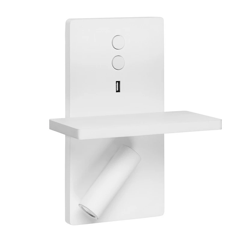 La lámpara de pared E-Lamp combina la luz indirecta y la luz de lectura para crear una fuente de luz moderna que promete una práctica iluminación adicional junto a la cama, en el rincón de lectura o en la habitación del hotel. La carcasa de aluminio rectangular, alineada verticalmente, aloja en su parte posterior LEDs blanco cálido, cuya luz ilumina indirectamente la habitación a través de la pared. En la parte delantera, un punto cilíndrico que puede girar 180° y girar 90° proporciona una iluminación de lectura alineable. Encima de un estante para pequeños objetos de uso diario, se han instalado dos interruptores para el funcionamiento separado de las dos fuentes de luz, así como una salida de carga USB para smartphones, etc.