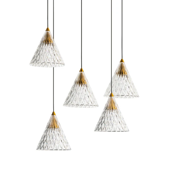 Veneto es una luminaria colgante de cinco lámparas LED con un exterior elegante y una colocación flexible. Sus colgantes se componen de conos acrílicos transparentes y estructurados con el aspecto del cristal clásico y elementos metálicos en acabado de latón. Estos últimos albergan los LEDs de color blanco cálido, cuya luz se emite directamente hacia abajo y se refleja y refracta de forma atractiva desde los laterales. Los largos cables salen del lateral de la marquesina y pueden fijarse de forma descentralizada al techo con puntos de fijación adicionales, de modo que la posición y la altura de los colgantes pueden determinarse de forma ideal para la mesa o la zona que se desea iluminar.