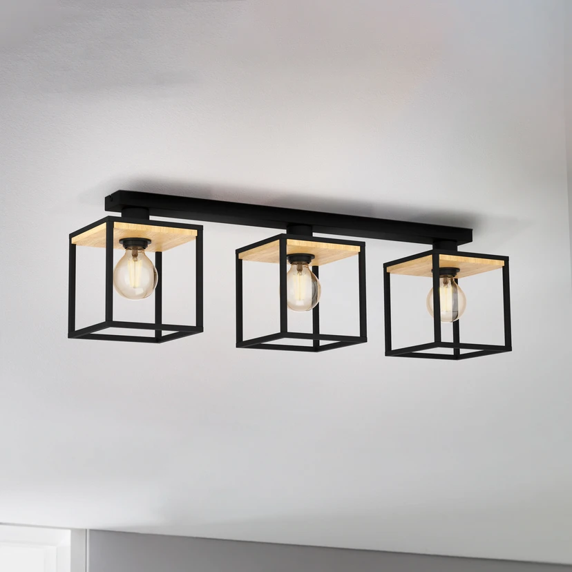 Libertad plafón, longitud 86 cm, negro/madera 3 luces. Tiempo de entrega: 8 - 11 semanas