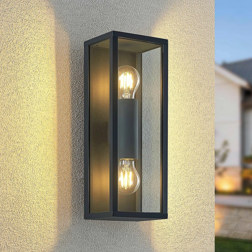 El aplique de exterior Peldar destaca por su diseño especial. La carcasa es de aluminio y está pintada de gris oscuro, lo que hace que destaque visualmente del entorno. La pantalla es de cristal, de modo que las dos fuentes de luz se ven bien desde todos los lados.