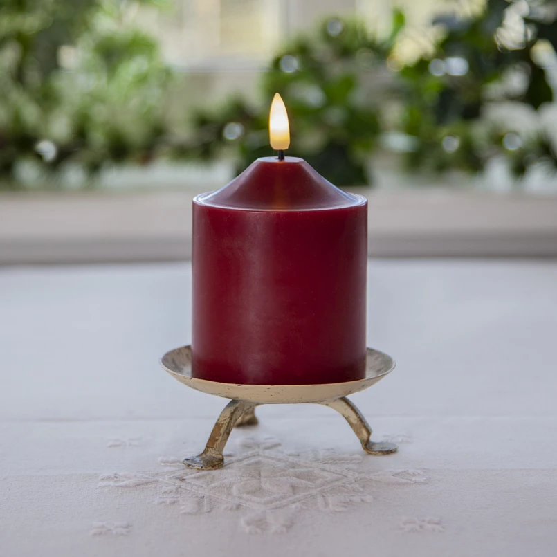Vela decorativa LED Flame de cera burdeos que funciona con pilas para uso en interiores - con función de temporizador La vela LED Flame es una opción práctica, especialmente para decoraciones navideñas en el hogar. La vela decorativa está hecha de auténtica cera de color rojo vino y tiene la forma de una clásica vela de pilar. Puede colocarse en cualquier lugar gracias a su funcionamiento con pilas (2 x AA - exclusivo). Puede encenderse automáticamente mediante un temporizador (6 h encendida, 18 h apagada).
