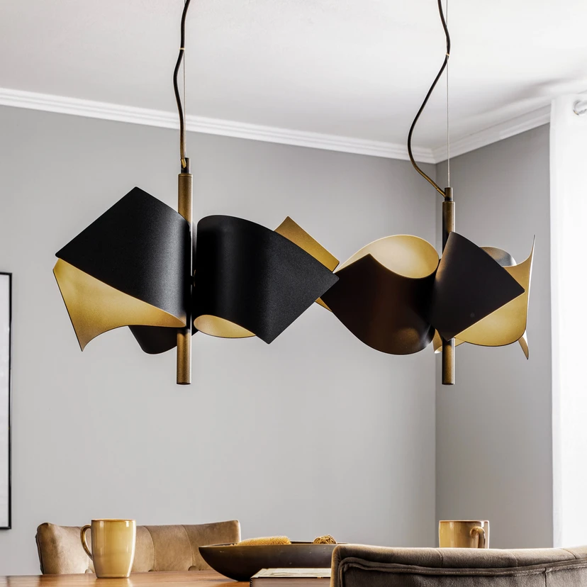 Lámpara colgante Imron de 6 luces fabricada en hierro en una combinación de colores negro arena - creada por Ingo Thiele Imron aporta acentos llamativos a su concepto personal de diseño de interiores y se presenta en una sutil combinación de colores. Consta de un baldaquín alargado al que se fijan dos suspensiones, cada una de las cuales lleva una pantalla. Estas pantallas tienen una forma emocionante y juguetona, y cada una puede equiparse con tres fuentes de luz. La lámpara colgante Imron es ideal para iluminar un salón o un dormitorio, pero también puede utilizarse para iluminar una mesa de comedor. Su forma especial se remonta a la cartera del diseñador Ingo Thiele.