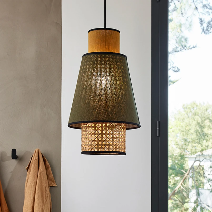 Lámpara colgante Singapour S con pantalla de mimbre vienés y textil Esta fuente de luz aporta un toque de estilo asiático a salones, salas de estar y restaurantes. En la serie Singapour, la marca francesa de diseño MARKET SET combina hábilmente diferentes materiales, gradaciones de color y formas geométricas. La pantalla de la lámpara colgante Singapour S tiene una esfera interior cilíndrica hecha de ratán, que está entretejido en una trama vienesa. También hay un pequeño cilindro superior y una pantalla exterior troncocónica de tejido de lino en colores contrastados. Los bordes de algodón negro acentúan las transiciones como un recurso estilístico moderno. La suspensión con dosel metálico y cable textil es de color negro.