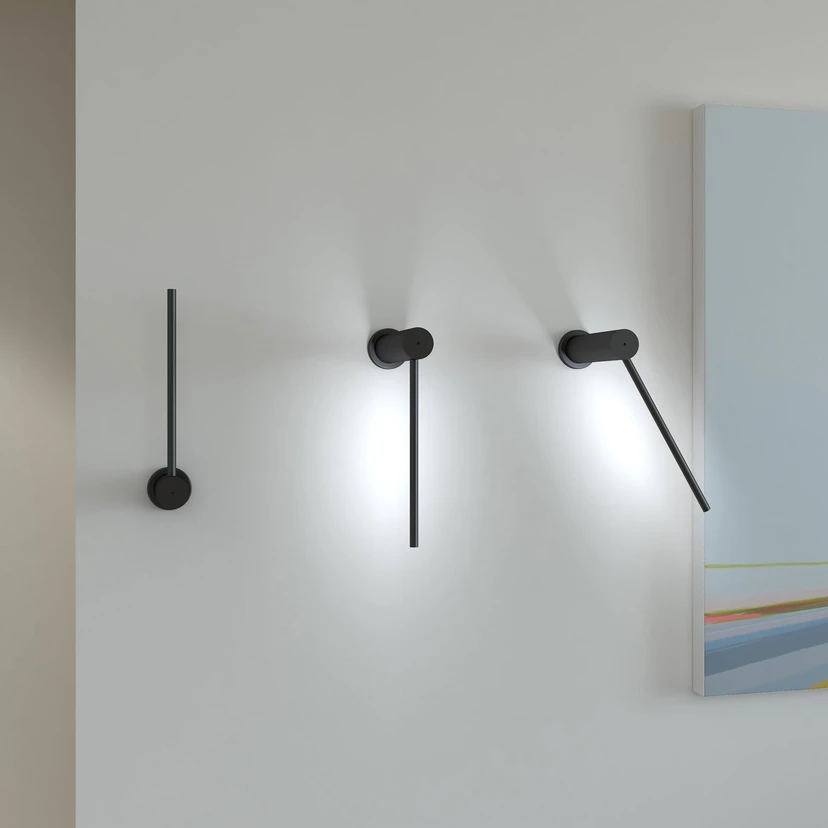 Con su diseño sencillo y a la vez independiente, la lámpara de pared Mosca llama inmediatamente la atención. La estructura de aluminio, totalmente negra, consiste en un cuerpo cilíndrico que sobresale horizontalmente de la pared y una varilla unida a su extremo en un ángulo de 90º. Esta última está equipada con LEDs en el lado que da a la pared, lo que proporciona una iluminación indirecta. El vástago se puede girar en el cilindro, de modo que se puede poner en cualquier posición, como una aguja de reloj giratoria.