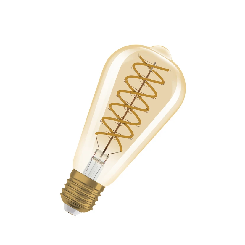 Fuente de luz LED Vintage 1906 Edison Filament con casquillo E27, 8,8 W, 2.400 K, atenuable Esta fuente de luz LED con la popular forma Rustika / ST64 o Edison de la edición Vintage 1906 de OSRAM es ideal para aplicaciones decorativas. La fuente de luz atenuable está equipada con una bombilla de cristal transparente teñido de oro y filamentos LED blanco cálido. Los filamentos en forma de espiral también garantizan un aspecto particularmente elegante, por lo que esta fuente de luz es ideal para su uso en luminarias abiertas y decorativas. Características técnicas: - temperatura de color particularmente cálida (2.400 K) - valor comparativo: 60 W (en relación con las fuentes de luz convencionales) con sólo 8,8 W - buena resistencia conmutable: 100.000 ciclos de conmutación - atenuable