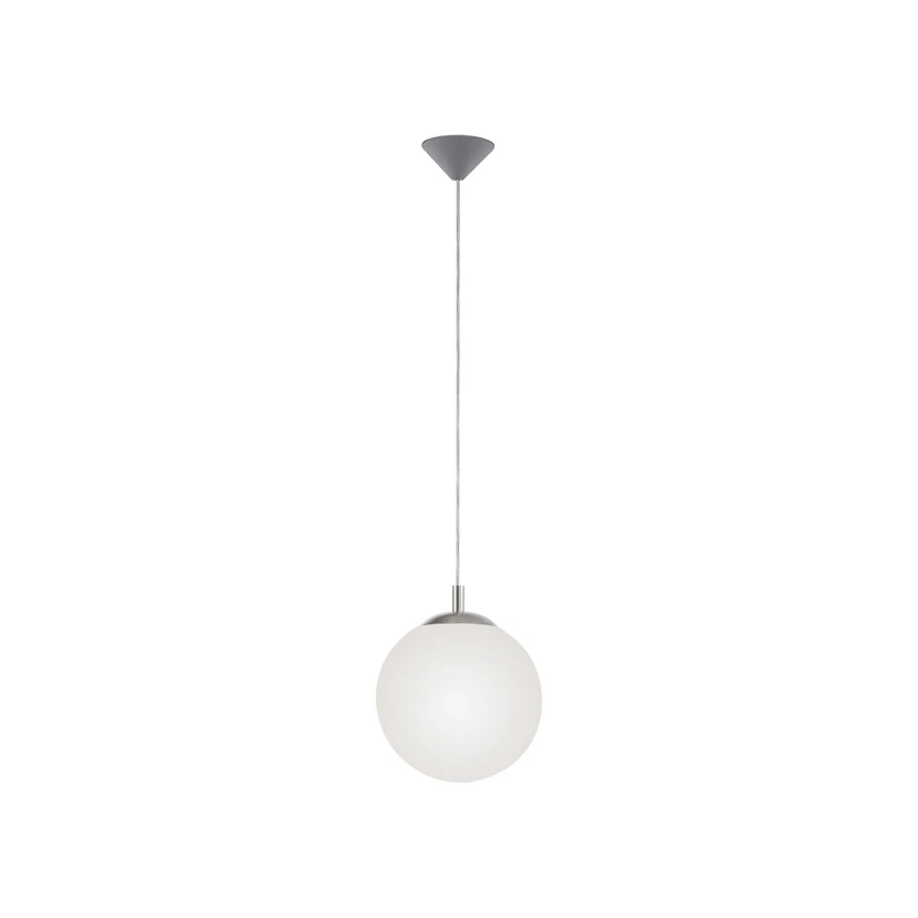 Lámpara colgante Bolo con pantalla de cristal blanco mate La lámpara colgante Bolo con dosel de color acero y pantalla de cristal blanco mate es un clásico atemporal, por ejemplo encima de la mesa de comedor, y se integra sin esfuerzo en su estilo de vida. Esta lámpara colgante se entrega sin iluminante, por lo que puede completarse con una lámpara E27 (máximo 40 vatios) según su elección. La pantalla mate garantiza una iluminación de bajo deslumbramiento.